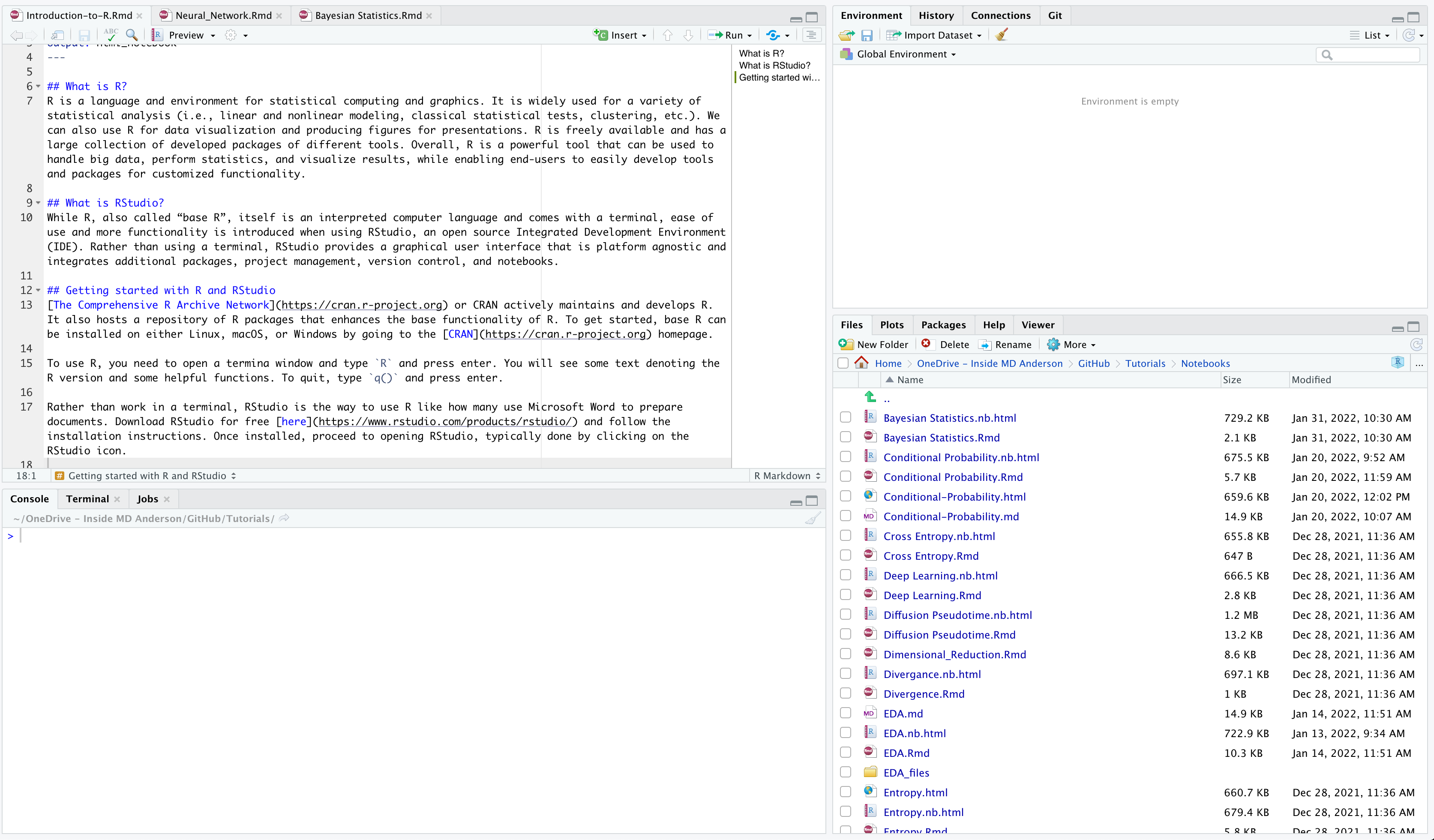 While R, also called “base R”, itself is an interpreted computer language and comes with a terminal, ease of use and more functionality is introduced when using RStudio, an open source Integrated Development Environment (IDE). Rather than using a terminal, RStudio provides a graphical user interface that is platform agnostic and integrates additional packages, project management, version control, and notebooks.